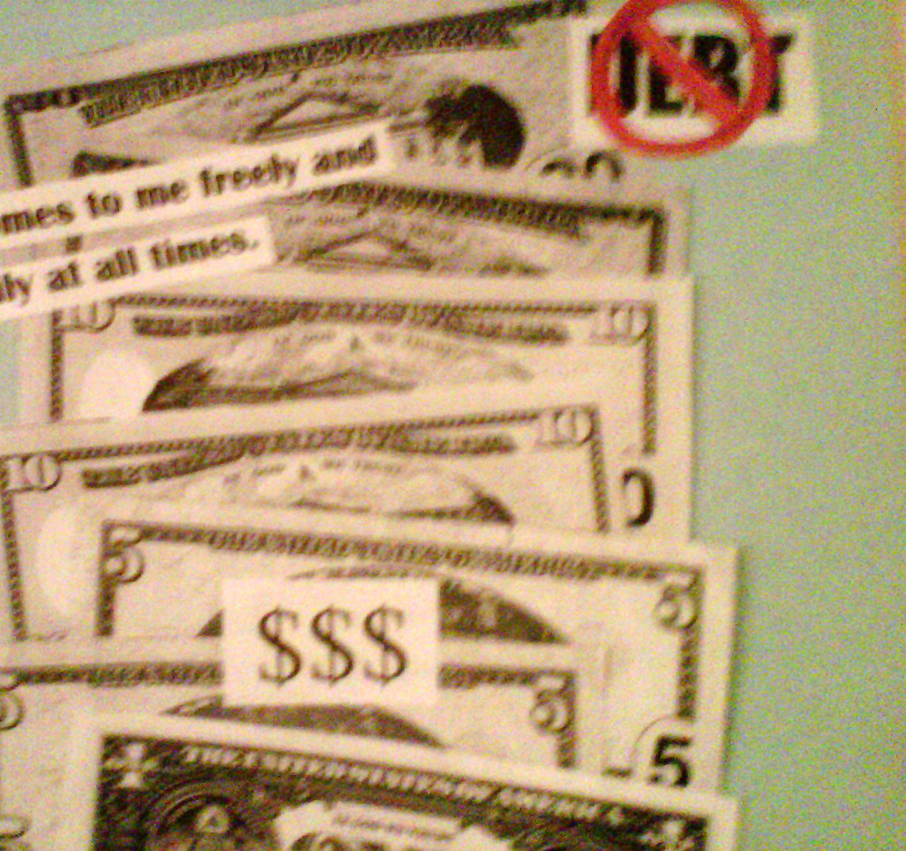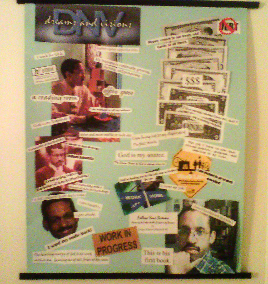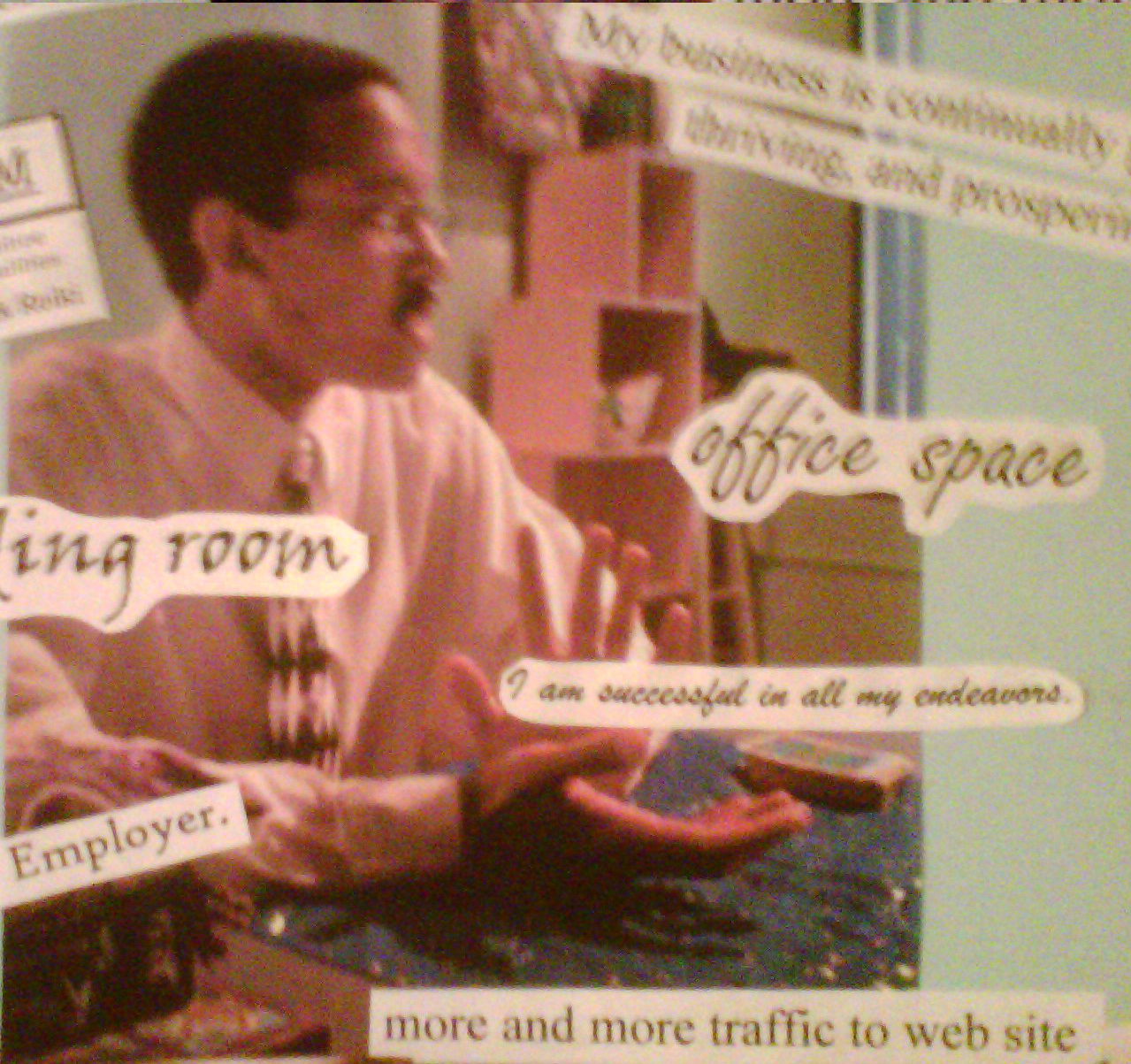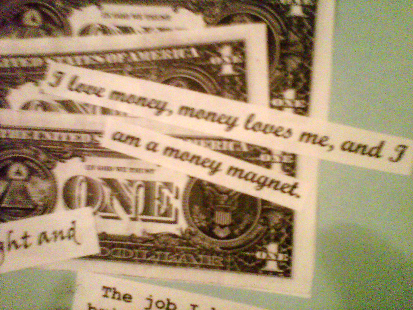 In another, I photocopied money in various denominations. I created a sign that had the word “DEBT” on it with a red circle and slash over it, as well as another sign that had dollar signs on it. An affirmation I pasted to that was: “Money comes to me freely and easily at all times;” another was “I love money, money loves me, and I am a money magnet.” The vision here was having more financial independence; at that time, I had five credit cards, all carrying a balance of various amounts.