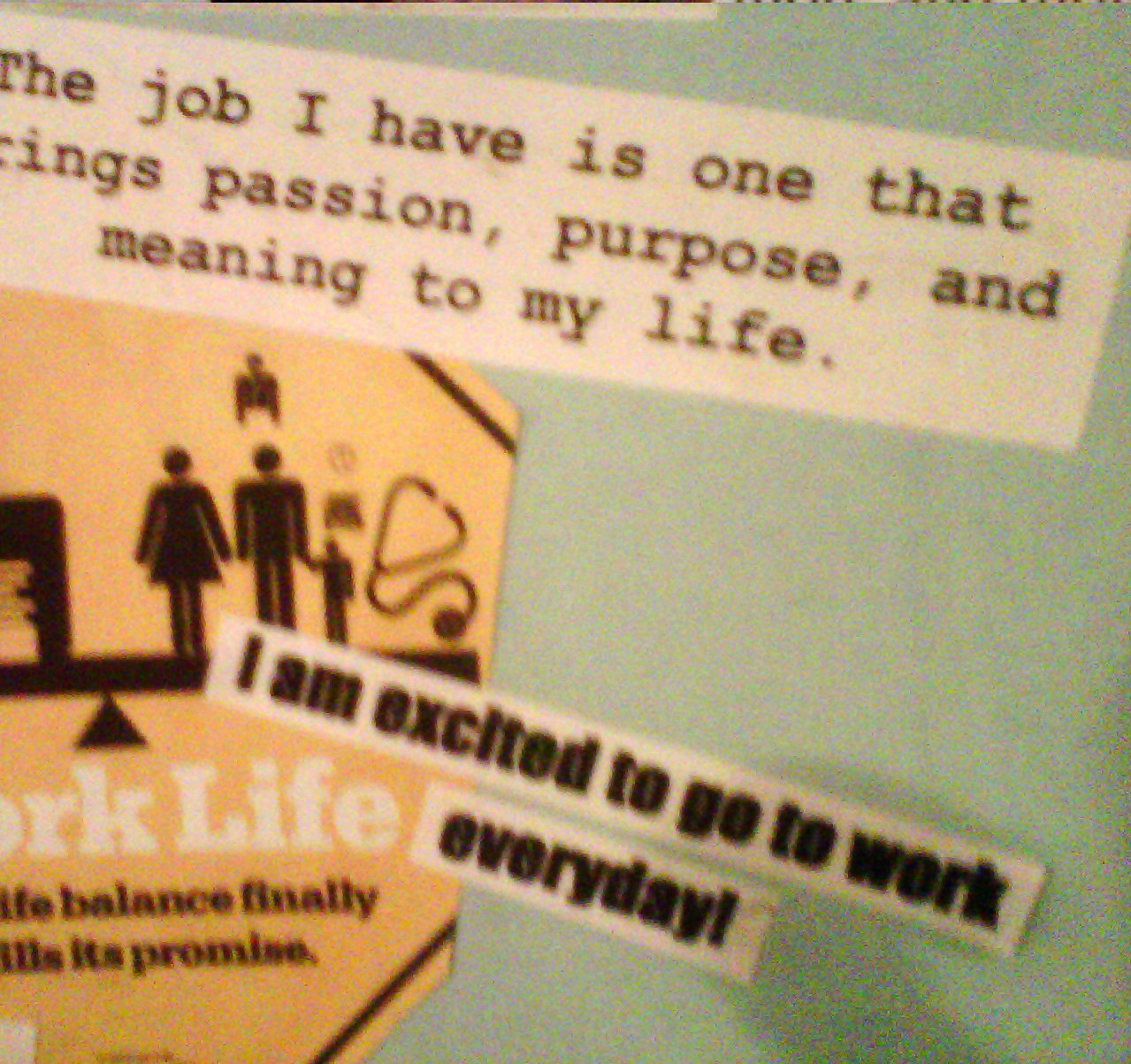 In yet another, I focused on what I wanted out of my Work. An image I have has “Work-Life Balance” along with an affirmation that reads, “The job I have is one that brings passion, purpose, and meaning to my life,” as well as, “I am excited to go to work everyday!”